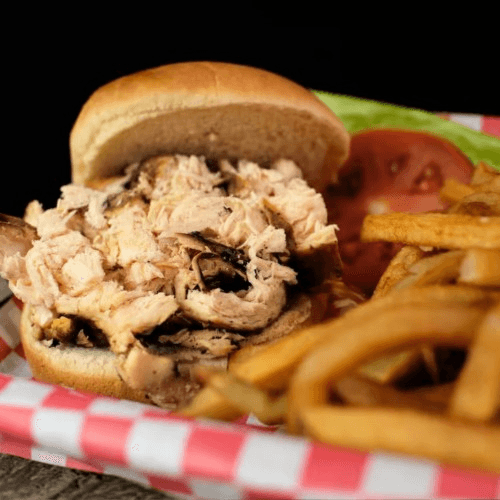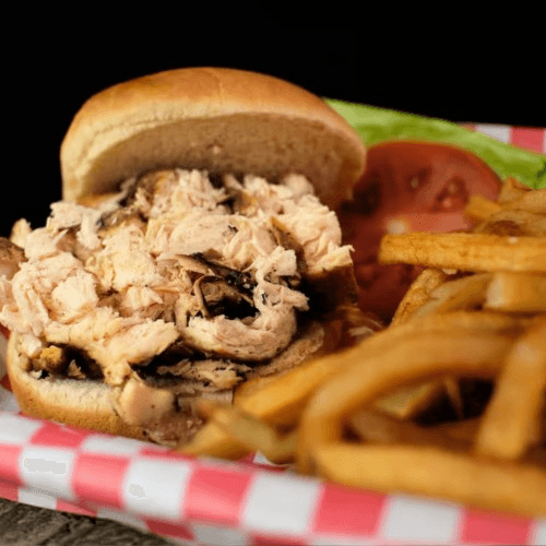 8 oz of smoked chopped chicken served with 2 sides and a bread