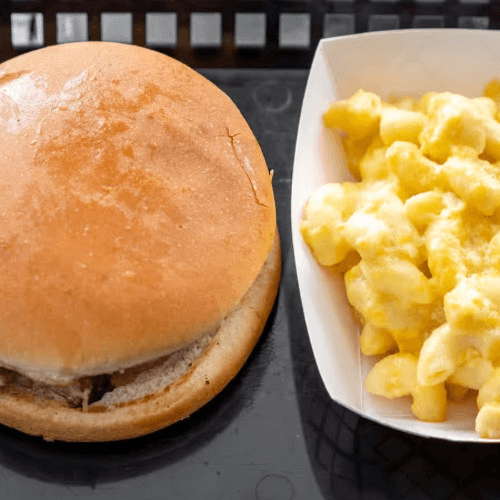 4 oz of rich pulled pork on a toasted bun served with 1 side