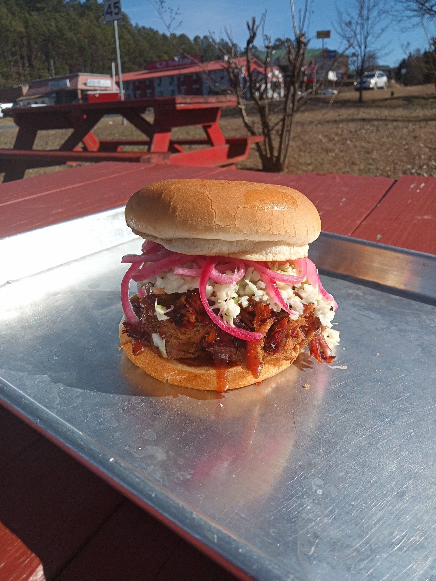 Our chopped brisket sandwich, topped with pickled red onions, sweet coleslaw topping, and our house-made boozy BBQ reduction on a toasted bun. Served with 1 side