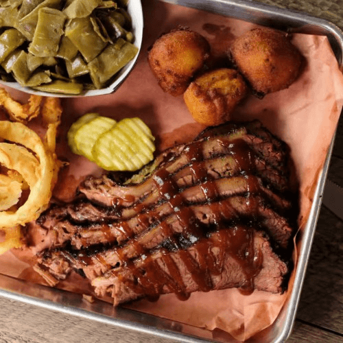 8 oz of smoked brisket (chopped or sliced) served with 2 sides and a bread